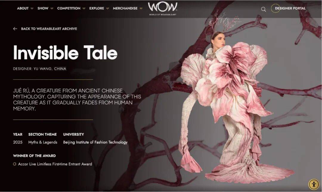 王玉作品《Invisible Tale》打算灵感源于《山海经》中的异兽“玃如”,作品通过极具张力的制型,模仿了神兽渐渐消灭的形状。她高明应用怪异的褶裥肌理与红白配色,隐喻工业污染对自然水源的腐蚀,深入钻探了当代工业文雅过程中神话信奉的消灭与处境偏护之间的相干。